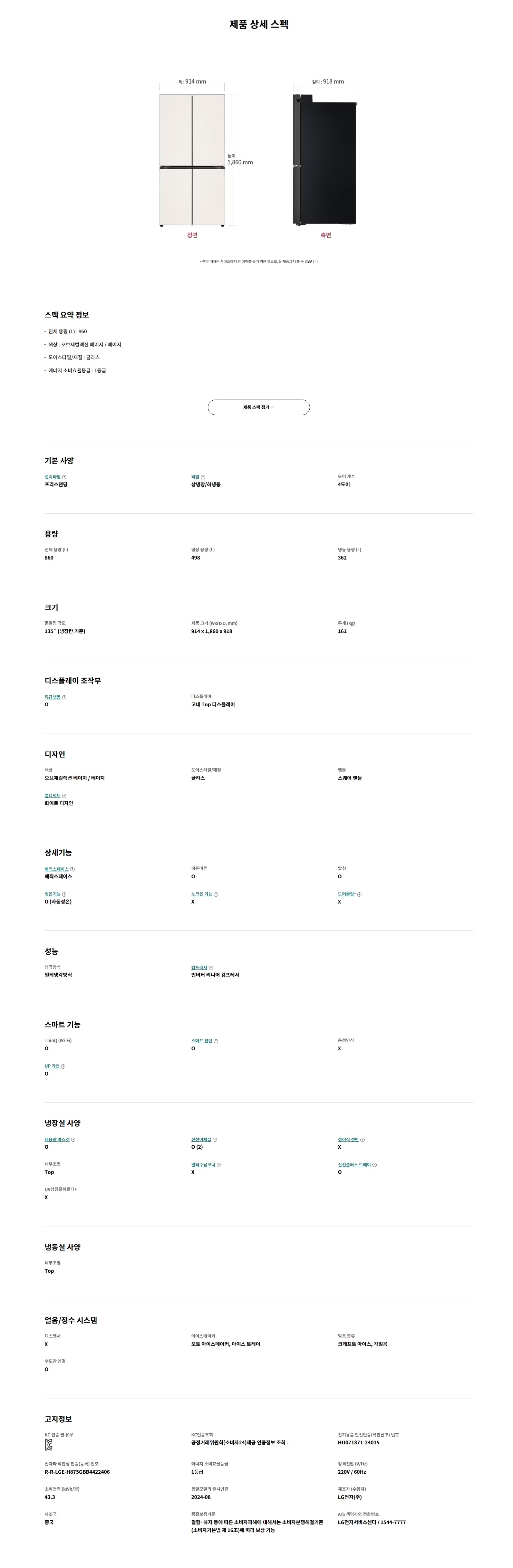 전체 용량 (L) : 860